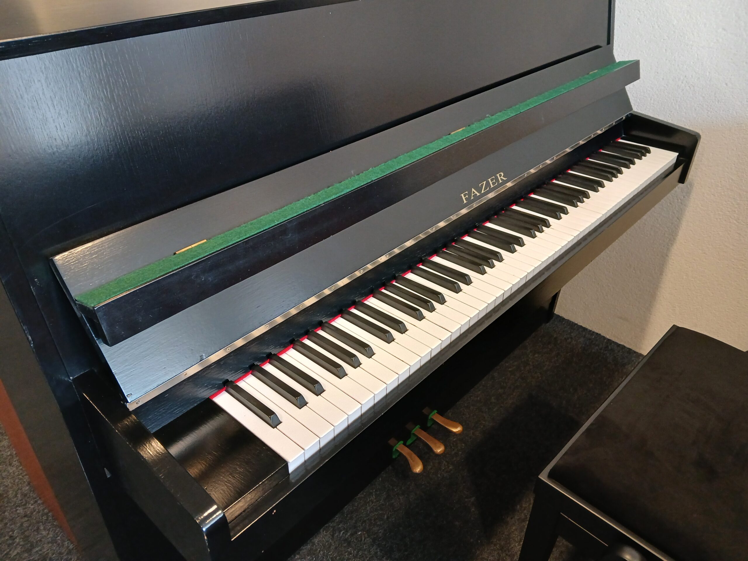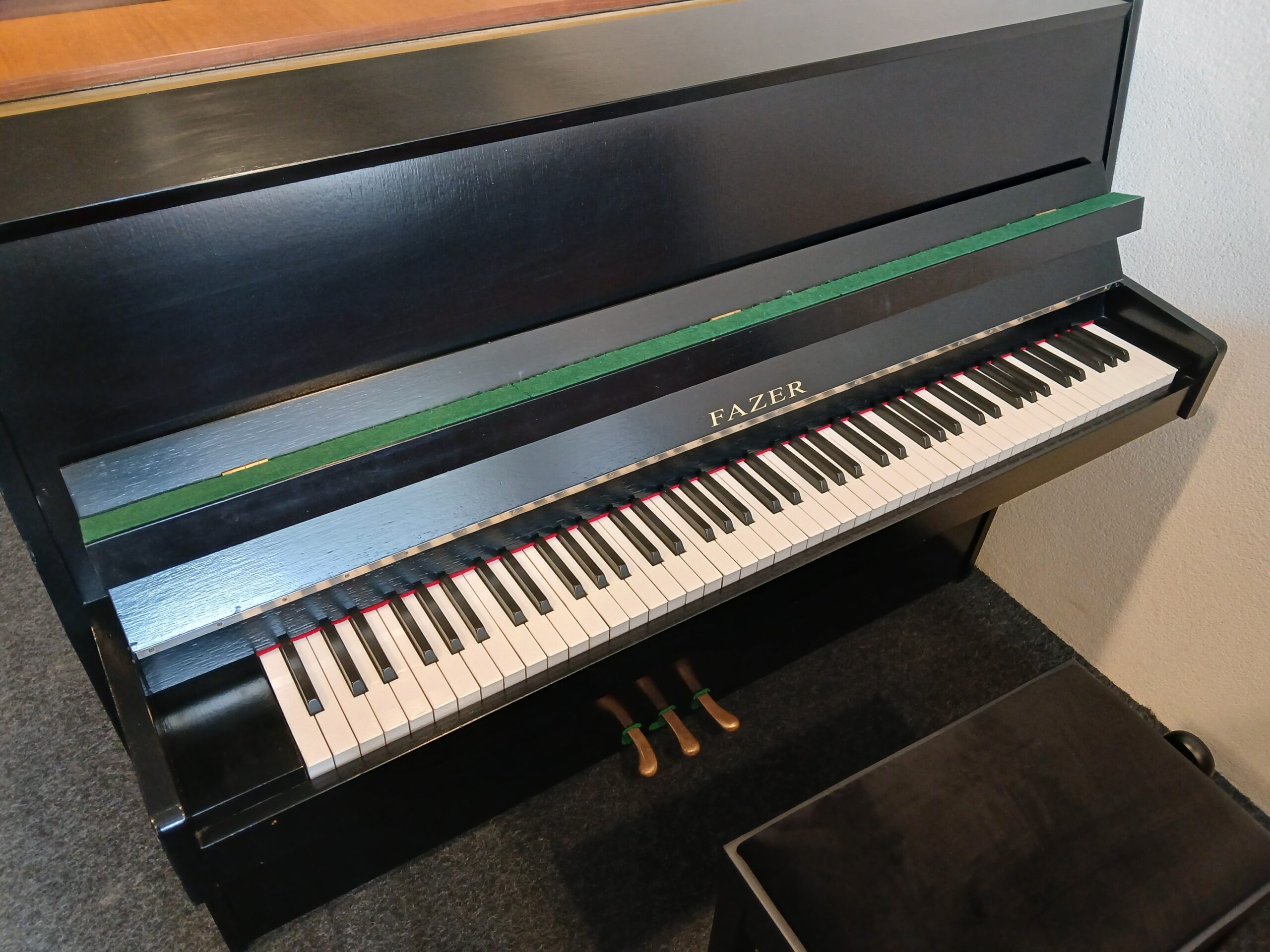 Deze Finse upright piano van het merk Fazer is gebouwd in de jaren 80 in Helsinki.