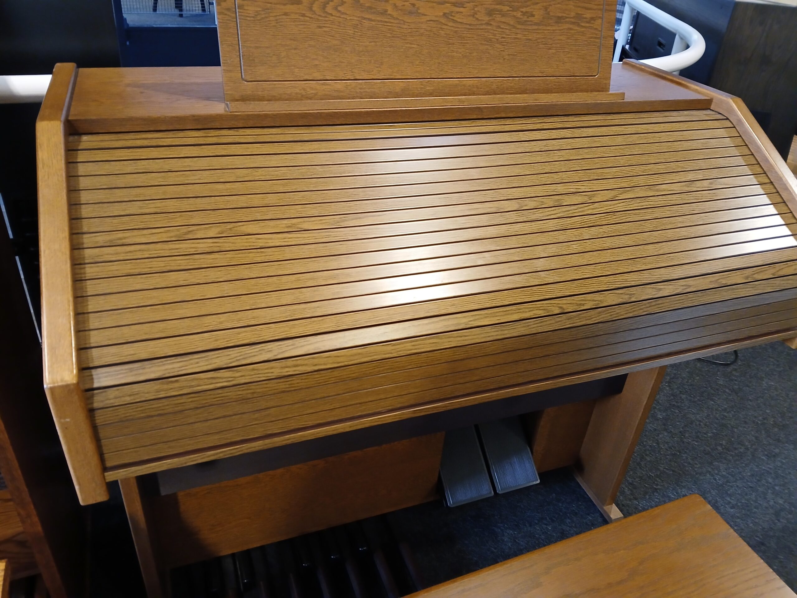 Het orgel is uitgevoerd in donker eiken en een afsluitbaar rolluik voor het toetsenpaneel. Bij de D4313 zit een praktische orgelbank met opbergruimte voor bladmuziek.